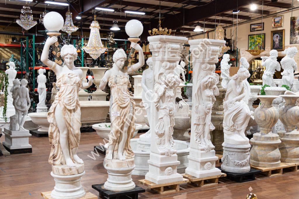 A biking clad beauty and a traditional bust of Plato are featured here. Each hand carved in hand picked statuary white marble. Our museum quality marble statues are 2nd to none.
