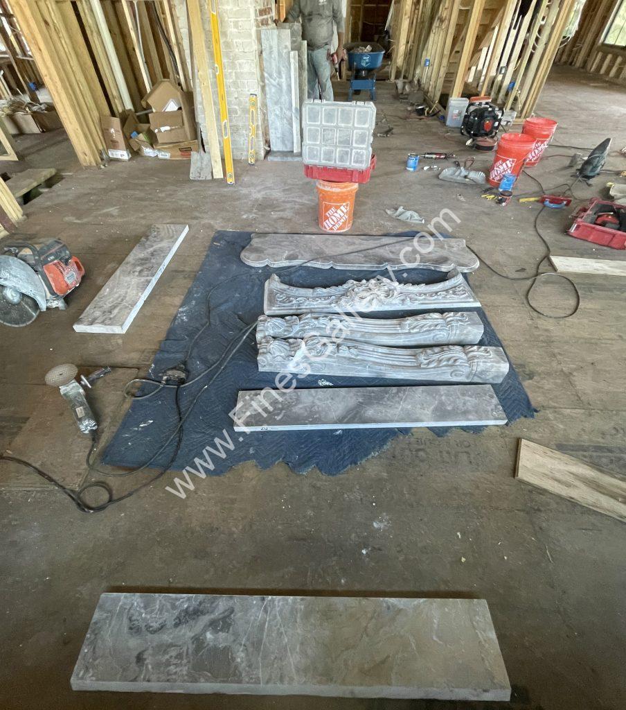 The marble fireplaces will be delivered in sections. The installing stone mason will lay them out and site-measure any of the sections that may need to be cut-on-site, prior to starting the installation process.